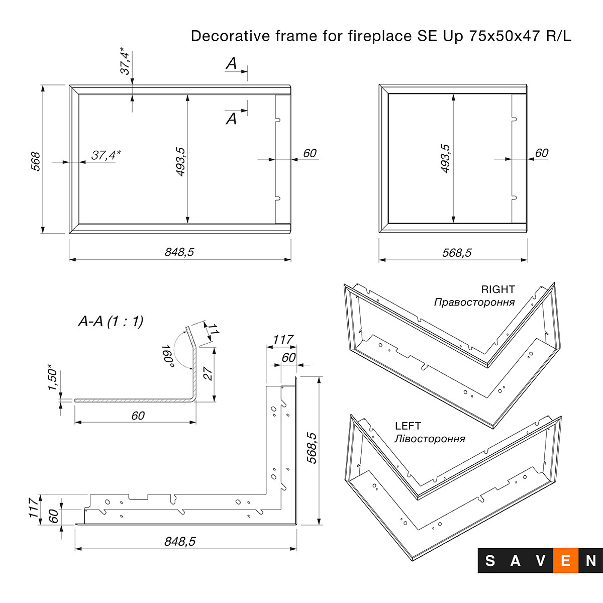 Розмір декоративної сталевої рамки для каміна пристосовано спеціально для монтажу з кутовою сталевою топкою з механізмом гільйотини SAVEN Energy Up 75х50х47 R.