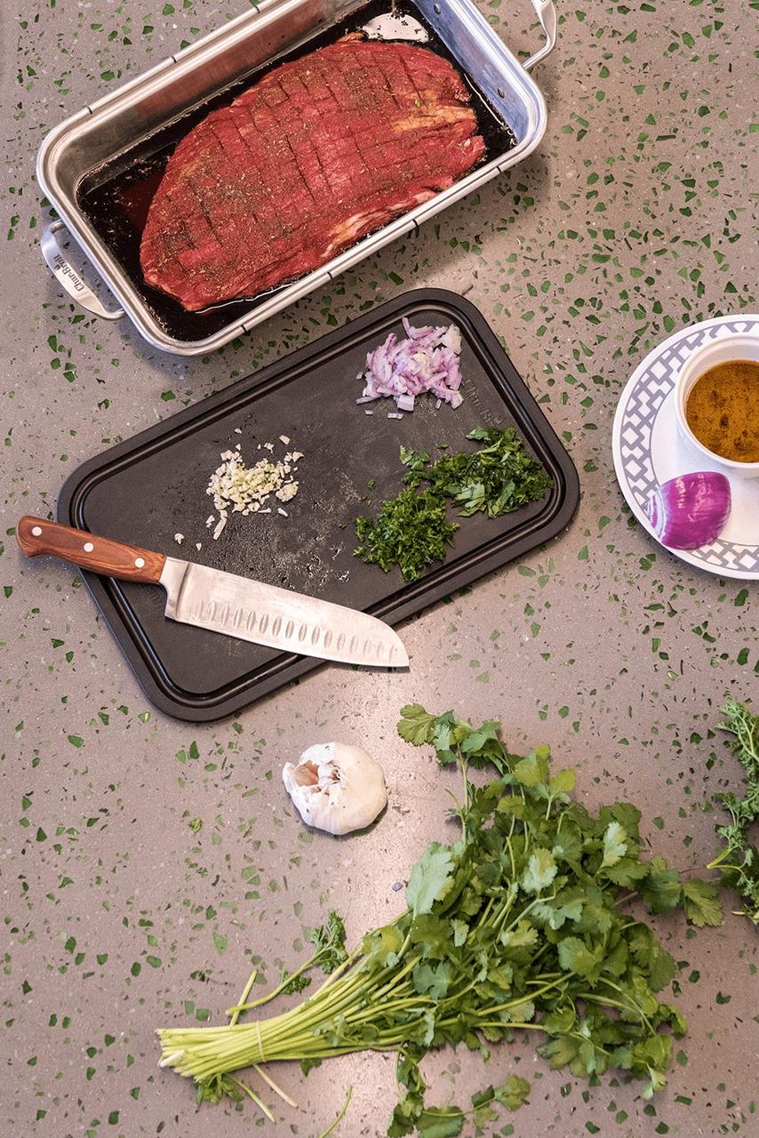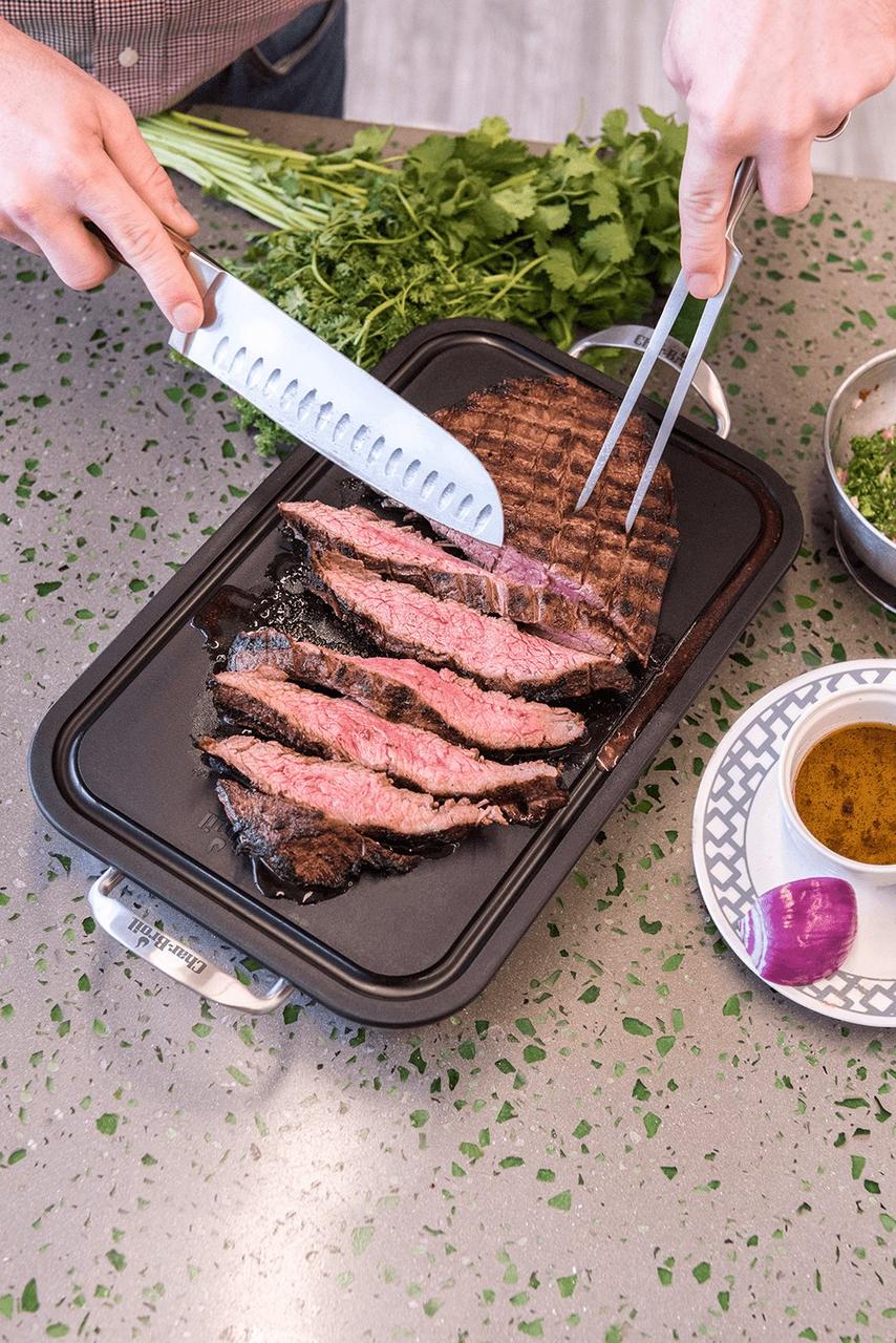 Глибока страва з неіржавкої сталі розміром 22 на 35 см досить міцна, щоб витримувати температуру вашого гриля, але також ідеально підходить для використання у вашій духовці, що робить її ідеальною для обсмажування, випікання або приготування на грилі. Пластикова обробна дошка із сіковою канавкою може використовуватися як кришка для приготування, зберігання і транспортування, даючи змогу вам маринувати м’ясо та зберігати в холодильнику до готовності до готування.