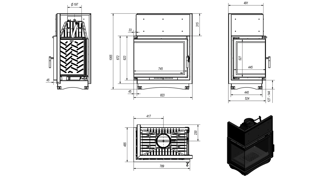 Класична передня частина топки викладена жаростійкою керамікою, яка витримує температуру до 660 °C.