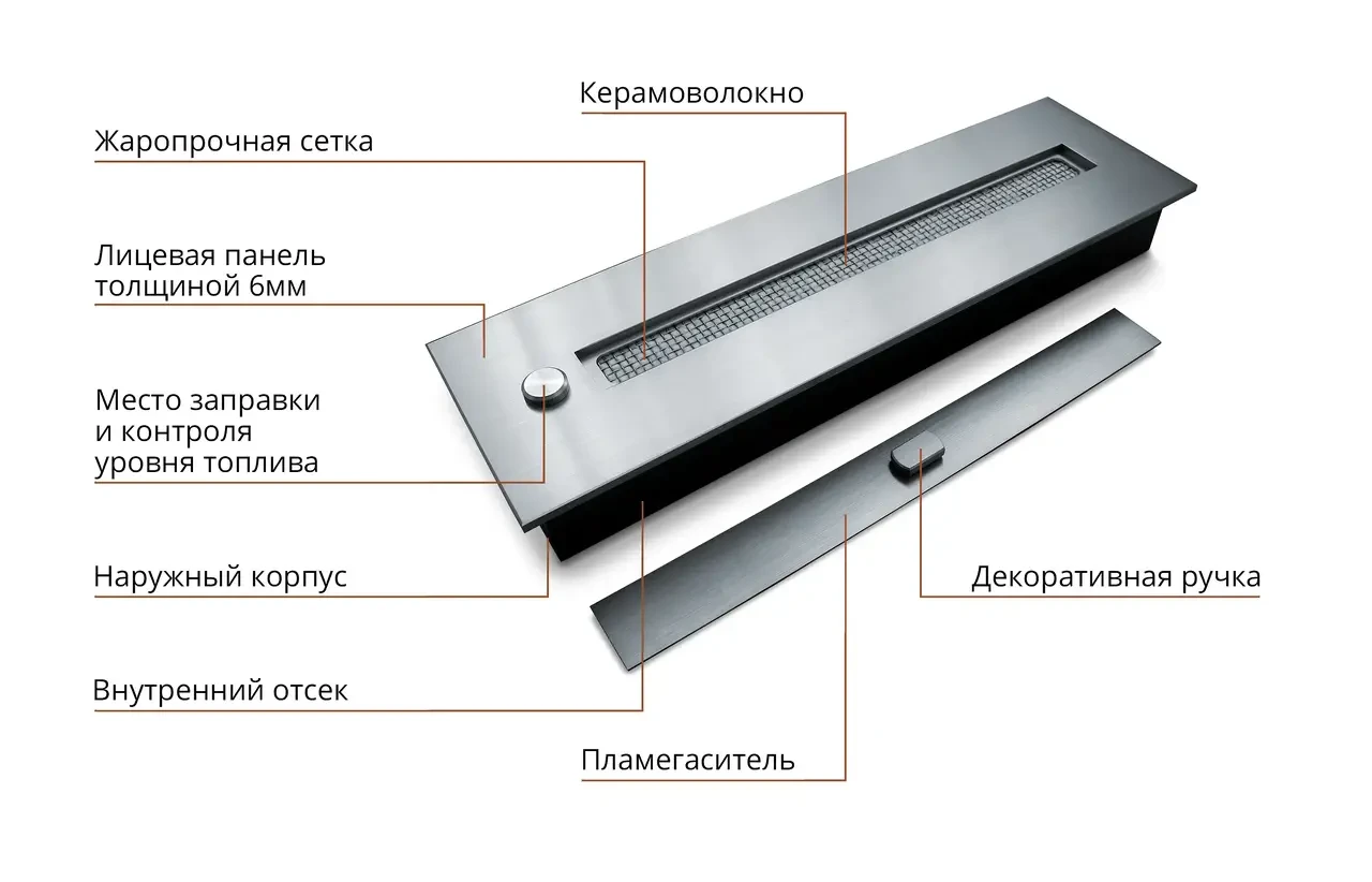 - Внутренее заполнение- керамические волокна с абсорбирующими свойствами, удерживают биоэтанол, исключают хлопки, вспышки, препятствуют утечки биотоплива.