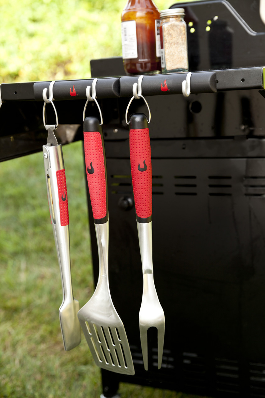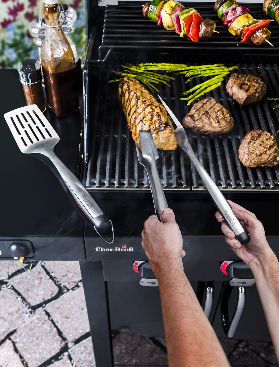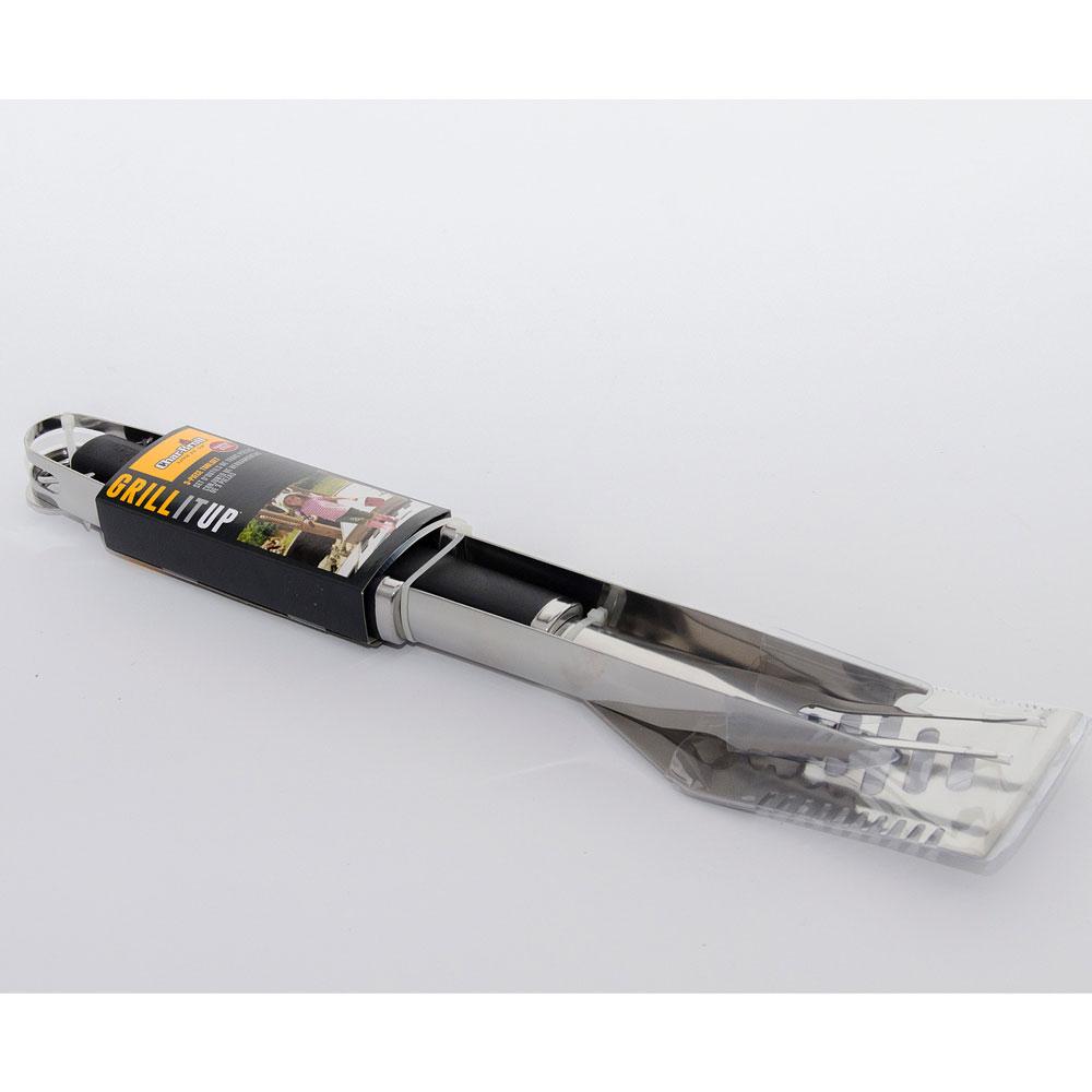 Щипці, лопатка та вилка для м’яса. Інструменти виготовлені з неіржавкої сталі, з довгими ручками. Обов’язковий набір для гриля. З їхньою допомогою ви з легкістю перевернете будь-які продукти у важкодоступних місцях.