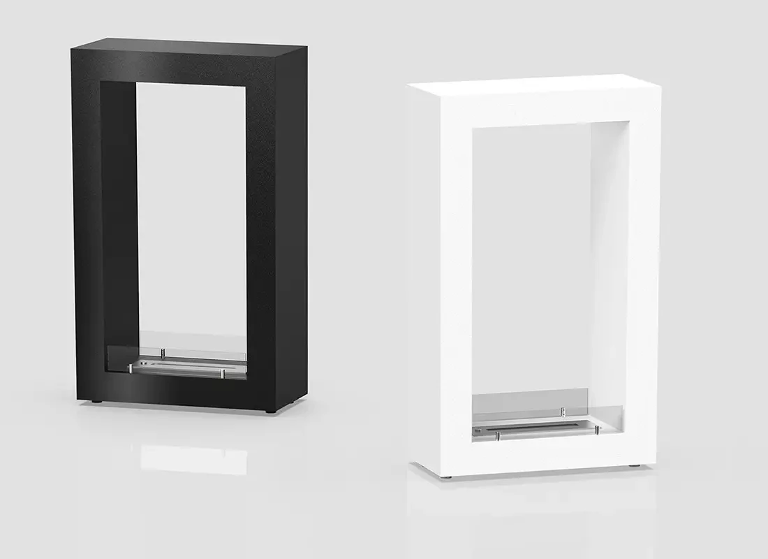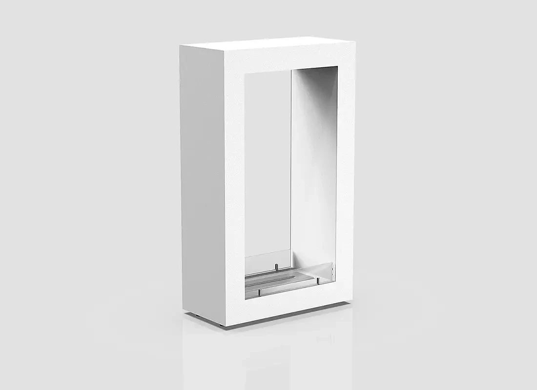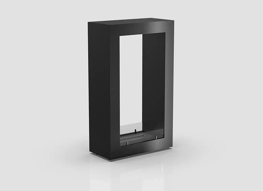 Підлоговий камін виготовлений як окремо стоїть двосторонній біокамін, з можливістю переміщення під будь-який варіант інтер’єру у Вашій квартирі, будинку, котеджі, кафе або ресторані. Корпус вертикального підлогового каміна виготовлений з якісної сталі і пофарбований щільною термостійкою фарбою. Зовнішня поверхню каміна може бути забарвлена в будь-який колір за шкалою RAL, близько 220 колірних варіантів. Паливний блок або пальник каміна на рідкому паливі відтворює приємне живе полум’я, яке буде гармонійно виглядати в Вашому інтер’єрі. Біокамін в корпусі представляє з себе окрему модель.