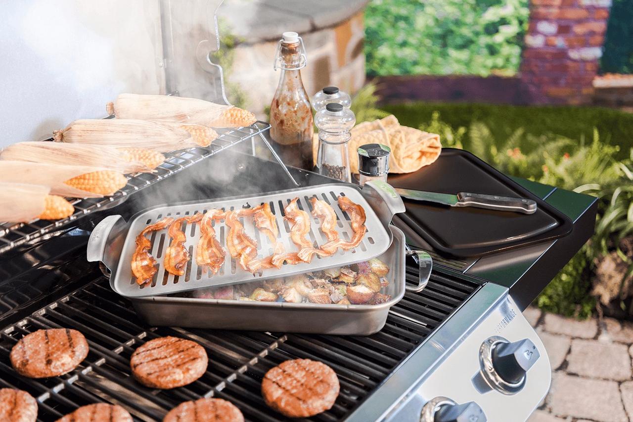 Плоский лист Grill+ виготовлений зі 100% неіржавкої сталі для досконалого стилю приготування, що робить його ідеальним для вашої печі або гриля. Готуйте на грилі морепродукти, овочі та багато іншого без проблем. Маленькі прорізи у верхній частині дають змогу пропустити тепло, але перешкоджають проходженню їжі через решітки. Використовуйте з глибоким деком Grill+ для універсальної кулінарії, додаючи воду або деревні тріски для пропарювання або копчення.