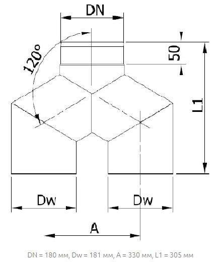 Трійник-штани 120° Darco Ø 180+ мм, одностінний, використовується для з’єднання двох труб-радіаторів до одного димоходу, що дозволяє значно збільшити ефективність відбору тепла з димових газів у конвекційній камері каміна. Виготовлений із чорної сталі, з товщиною стінки – 2 мм, покритої шаром термостійкої фарби – Senotherm, яка не виділяє диму та неприємного запаху під час експлуатації.